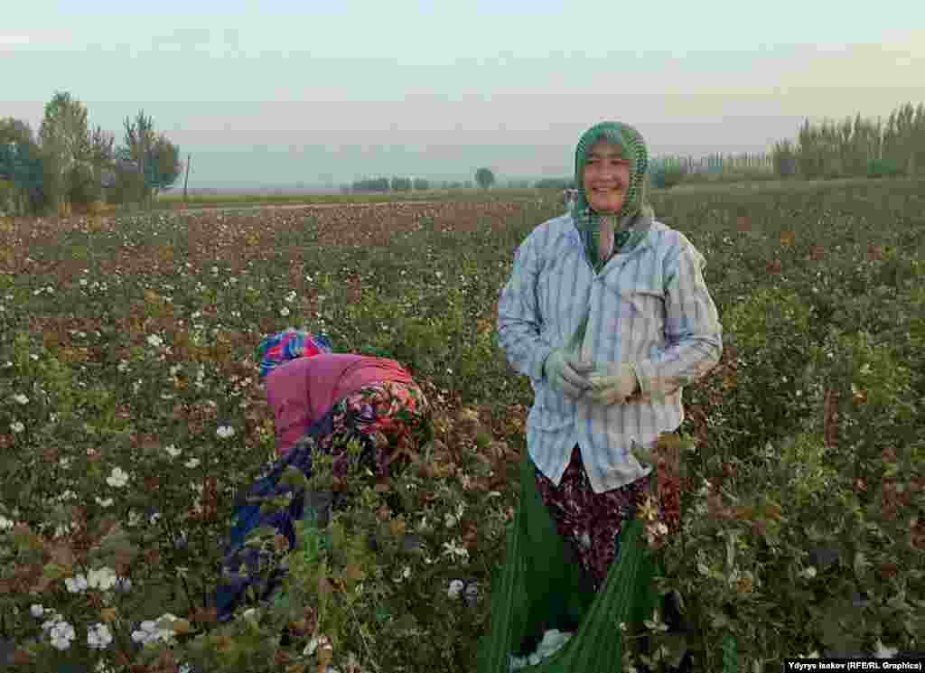 Пахта теримге жаш балдар да тартылат. Бул кыздын жашы он экиде. Күнүнө 25 кг. пахта терет.
