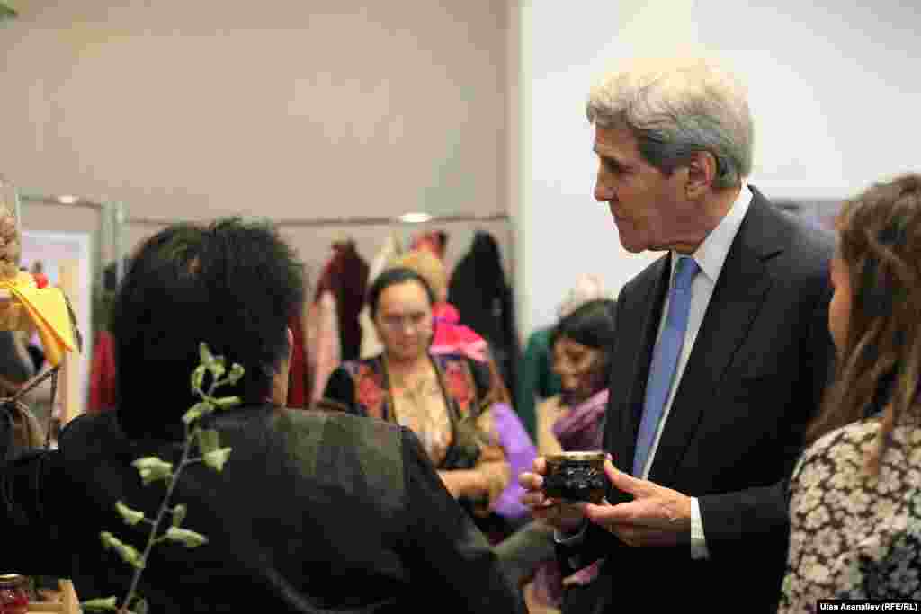 Имараттын ачылыш салтанатынан кийин Жон Керри АКШ элчилигинин жаңы имаратында өтүп жаткан көргөзмөдөн эки банка кыям менен эки куурчак сатып алды.