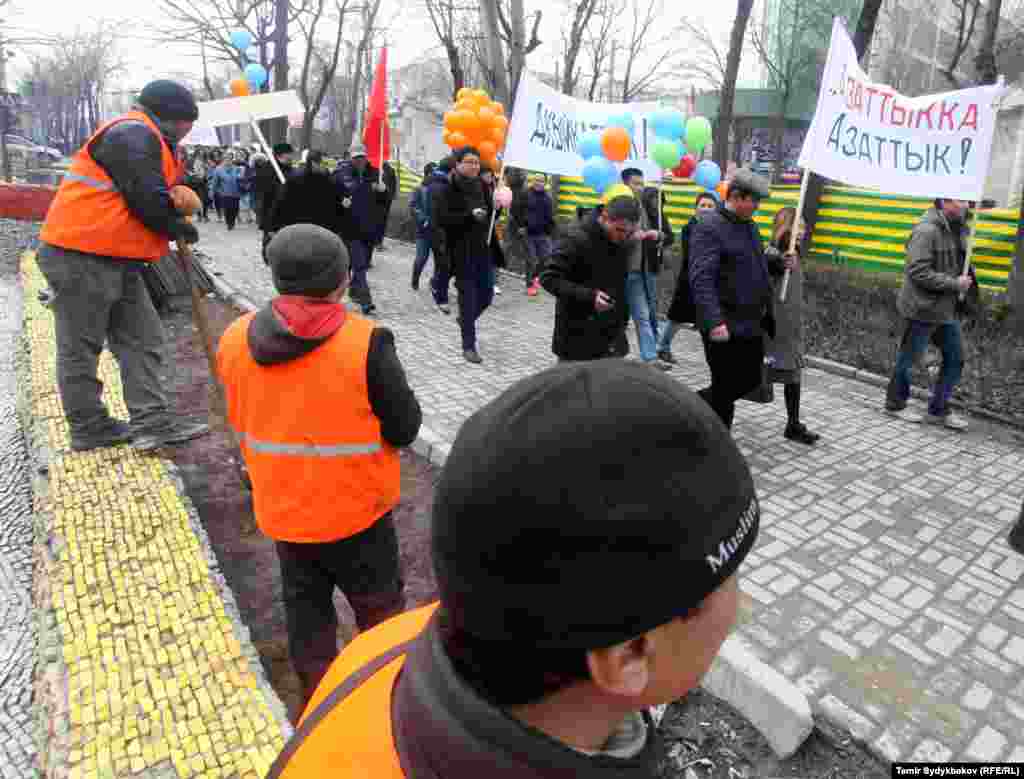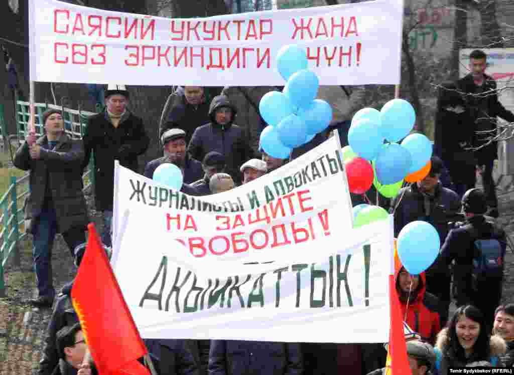 Жүрүшкө жүзгө жакын адам катышты. Алар бийликти сөз эркиндигин чектебөөгө үндөгөн жазууларды, шарларды жана желектерди кармап басышты.