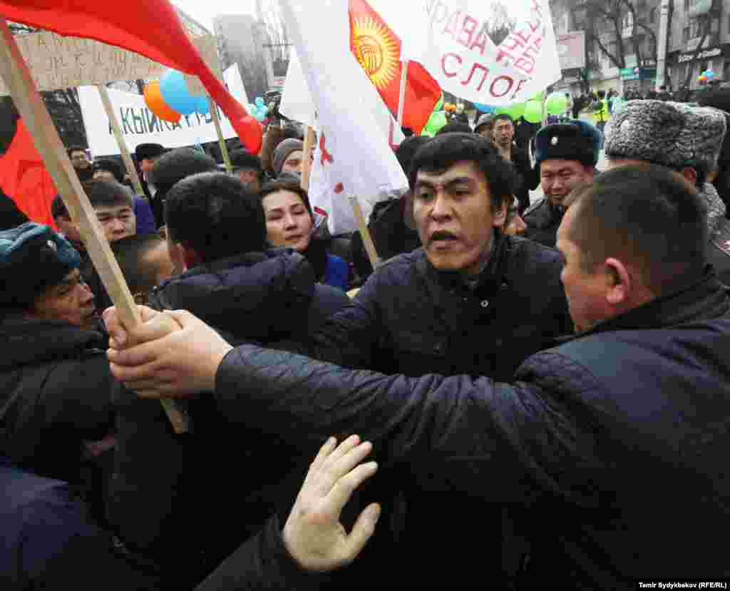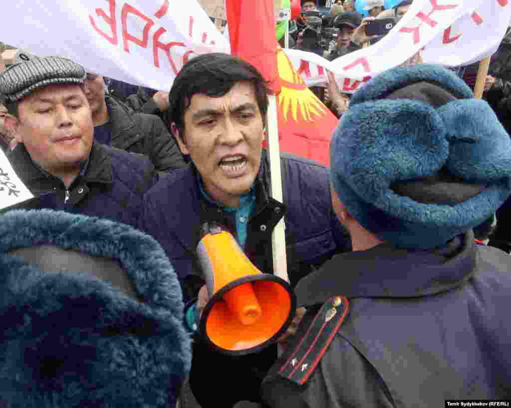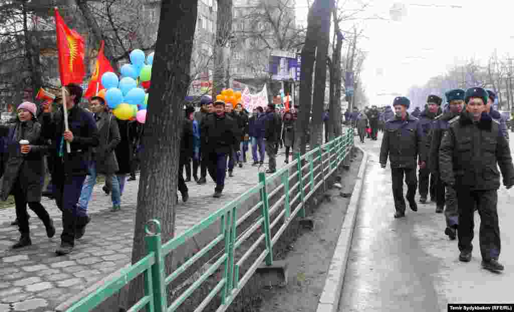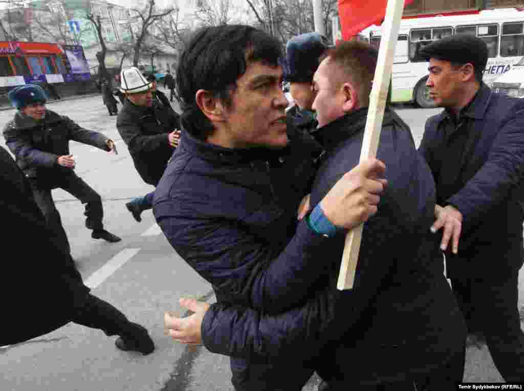 Жүрүштүн катышуучулары Бөкөнбаев көчөсүнөн чоң жолго чыгууга аракет кылганда милиция кызматкерлери айрым активисттерди кармап кетти. Жүрүштүн уюштуруучусу, коомдук ишмер Эдил Байсалов иш-чара үчүн мэриядан уруксат алынганын, милициянын кармаганы мыйзамсыз экенин айтууда.