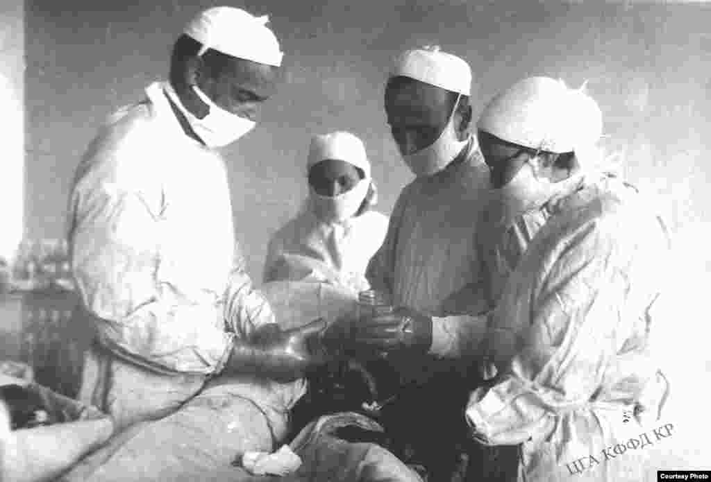 Кыз-келиндер жарадар жоокерге биринчи жардам көрсөтүүдө. 1941-42-жылдардагы сүрөт.