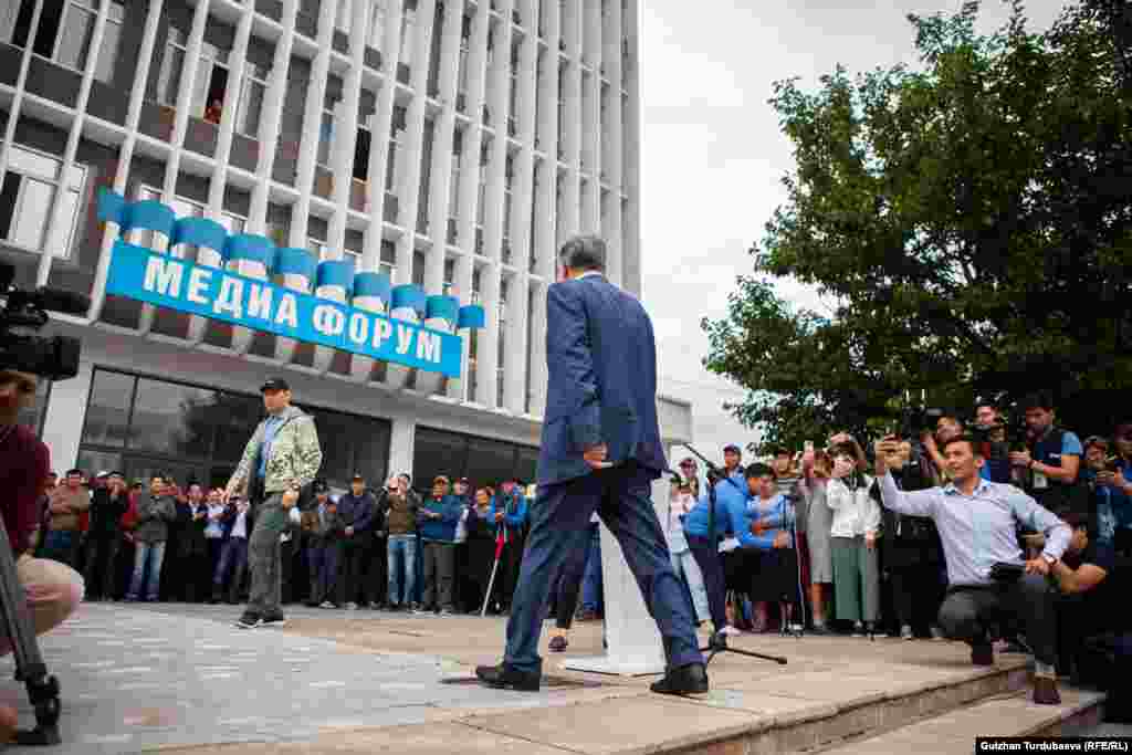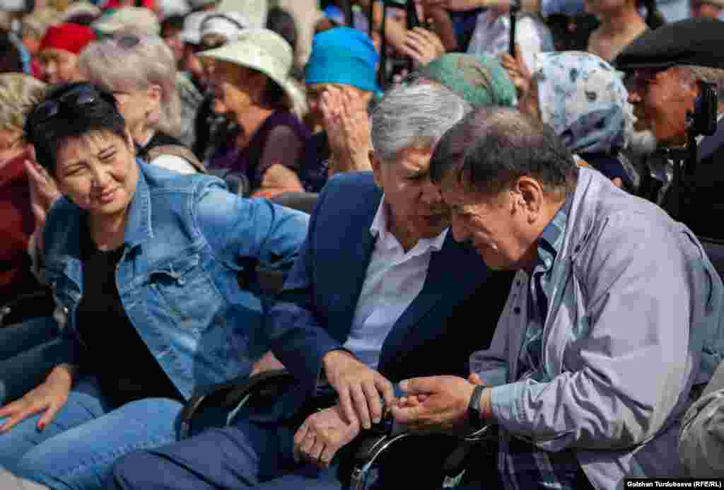 Мурдагы президент Алмазбек Атамбаев жана анын тарапкерлери Бишкектеги «Медиа Форум» имаратынын алдында президент Сооронбай Жээнбековдун бийлигине каршы митингге чогулушту.