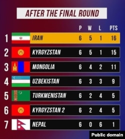 Жыйынтыгында Ирандын 18 жашка чейинкилер арасындагы курамасы 6 оюндун баарында жеңишке жетип, 16 упай менен биринчи орунду ээледи. Кыргызстан курамасы 6 оюнда 15 упай топтоп күмүш медал алды. Кыргызстандын улуттку курамасы мелдеште Иран курама командасына гана (1:3) утулган.
