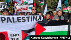 Алар “Палестинага боштондук”, "Кыргынды токтоткула" деп жазылган плакаттарды көтөрүп чыгышты.