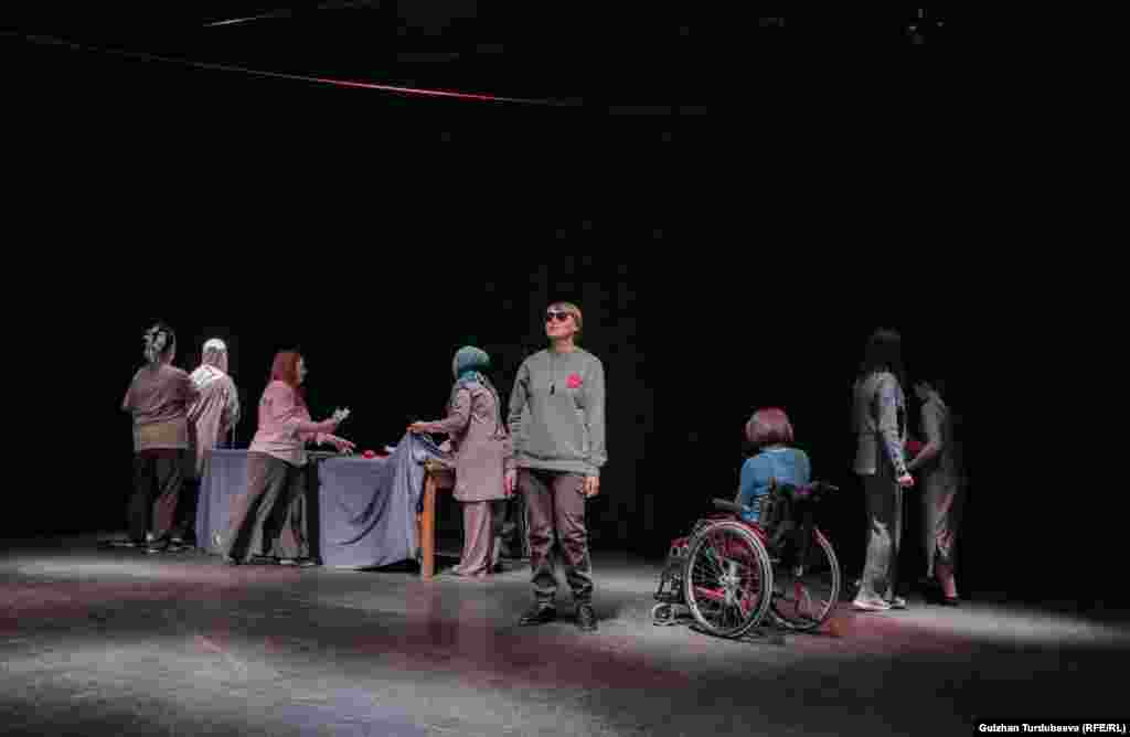 Спектаклде көзү азиз, кулагы начар уккан жана башка майып кыз-келиндер роль жаратышты. Алардын бири дагы мурда-кийин сахнага чыгып көргөн эмес. Ошентсе да алар койгон спектакль көрүүчүлөрдүн купулуна толгонун байкоого болот.