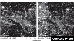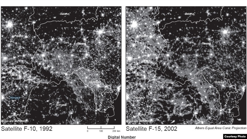 жайнап көбөйгөнүн сүрөттөрдөн көрөбүз. Ошол эле жылдары калкы жакырчылыкты баштан кечирген Молдова жана Украинада ар жыл сайын түнкүсүн чырак аз күйүп, карайган жерлер көбөйгөн. Береги ыкма статистикалык маалыматтары осол делген 40 өлкөдө да пайдаланылган.