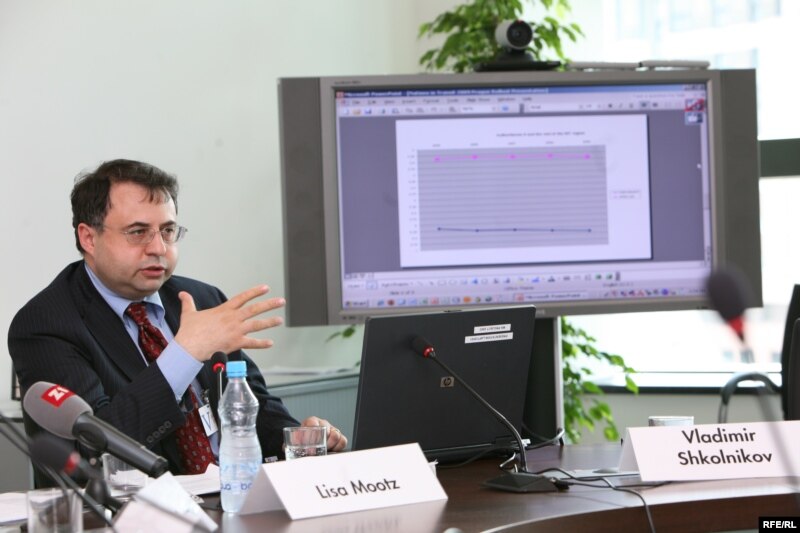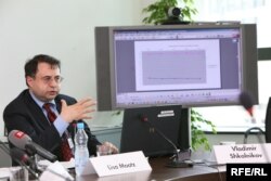 Владимир Школьников "Азаттыктын" жамаатына "Фридом Хаустун" 2008-жыл тууралуу баяндамасын тааныштырууда. Прага, 2009-жылдын 30-июну.