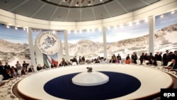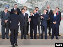 Аквиладагы саммитте Чоң сегиздин жана Бештин тобунун лидерлери президент Обаманы кол чаап күтүп алышууда. 9-июль.