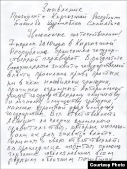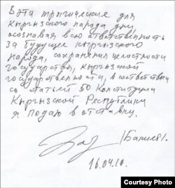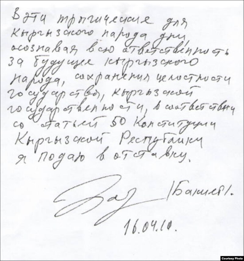 Курманбек Бакиев кечээ (15-апрелде) Казакстандын аймагында президенттик кызматын өз каалоосу менен өткөрүп берүү жөнүндөгү арызын жазып берген. Аны бүгүн эртең менен Кыргызстандагы Казакстандын элчиси, ЕККУнун элчиси убактылуу өкмөт башчысы Роза Отунбаеванын колуна тапшырды.