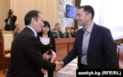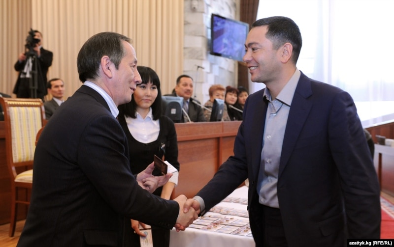 БШК төрагасы А. Сариев "Республика" партиясынын төрагасы Ө. Бабановго депутаттык күбөлүк тапшырууда.