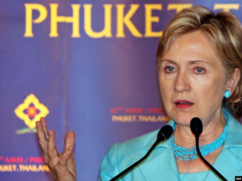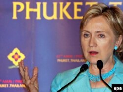 Мамкатчы Хиллари Клинтон АСЕАНдын Тышкы иштер министрлеринин жана АСЕАН регионалдык форумунун Тайланддын түштүгүндөгү Пхукет аралындагы саммитиндеги пресс-конференцияда. 22-июль.
