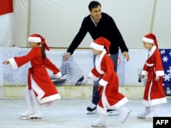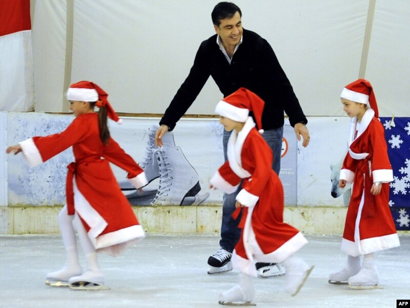 Грузин президенти Михаил Саакашвили Санта Клаустун кийимин кийген жеткинчектер менен муз үстүндөгү Жаңы Жыл оюн-шоогуна катышты. Зугдиди шаары. 2009-жылдын 31-декабры.