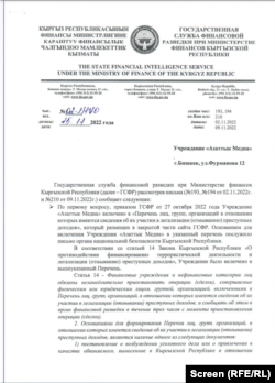- 15-ноябрь, 2022-жыл. Финансылык чалгын кызматы “Азаттык Медианын” банктык эсеби эмне үчүн бөгөттөлүп турганын түшүндүрдү. 15-ноябрда мамлекеттик кызмат берген түшүндүрмөдө “Азаттык Медиа” мекемеси “Кылмыштуу кирешени адалдаштырууга катыштыгы бардыгы тууралуу маалымат бар адамдардын, топтордун жана уюмдардын тизмесине” киргизилгени, буга Улуттук коопсуздук мамлекеттик комитетинин (УКМК) каты негиз болгону айтылат. Финчалгын кызматы “Азаттык Медиа” бул тизмеге “Террордук ишмердүүлүктү каржылоого жана кылмыштуу кирешени мыйзамдаштырууга каршы аракеттенүү жөнүндө” мыйзамдын 14-беренесинин негизинде киргизилгенин белгилеп, анын шарттарын көрсөткөн. "Азаттык Медиа" буга чейин эки жолу Финчалгын кызматына жана УКМКга кат жазып, түшүндүрмө менен кошо тиешелүү документтерди сураган. Мамлекеттик кызмат "саналуу гана кишилер көрө алат" деген гриф коюлгандыктан документтердин көчүрмөсү берилбей турганын билдирет.