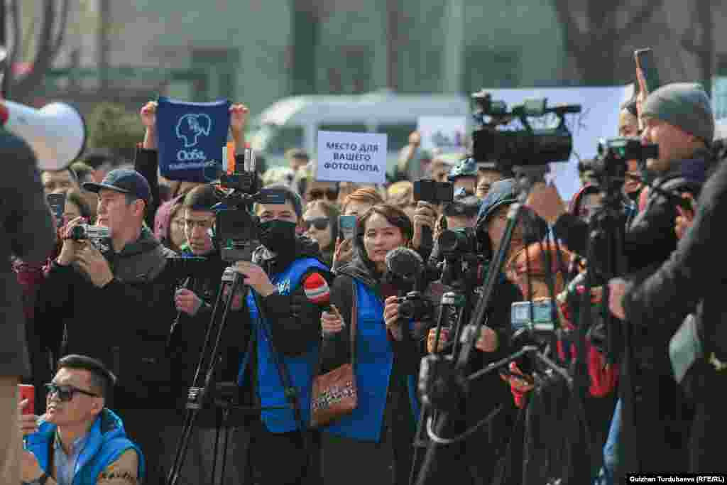 Уркуя Салиева атындагы «Революция каармандарынын» эстелигинин жанында аялдардын укуктарын коргоо акциясы өтүп, анда «Зордук-зомбулукка каршы!», «Эки жүздүүлүккө каршы!» деген өңдүү ураандар чакырылды. Акция саат 12:00до башталды.