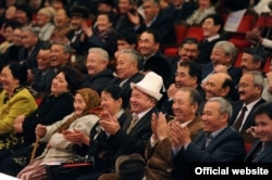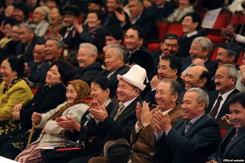 Акын Шайлообек Дүйшеев өзүнүн 60 жылдыгына арналган жыйында (ортодо ак калпакчан). Кыргыз улуттук филармониясы. 2011-жылдын 26-февралы. Кыргыз президентинин интернет барагындагы сүрөт.