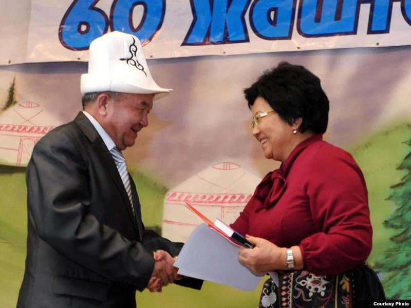 Кыргыз Президенти Роза Отунбаева Эл акыны Шайлообек Дүйшеевди 60 жылдык мааракеси менен куттуктоодо. Ат-Башы жергеси. 21.02.2011. Кыргыз президентинин басма сөз кызматы.