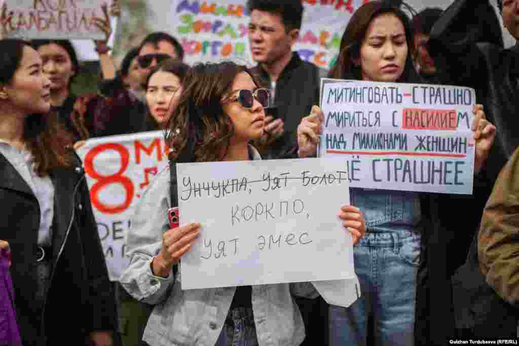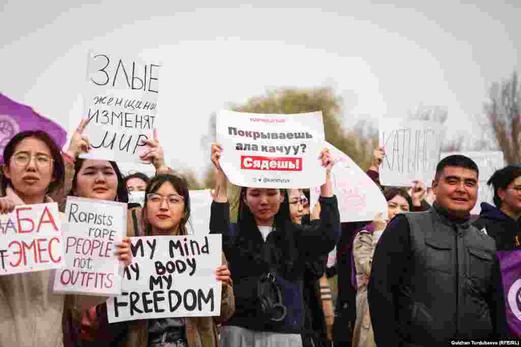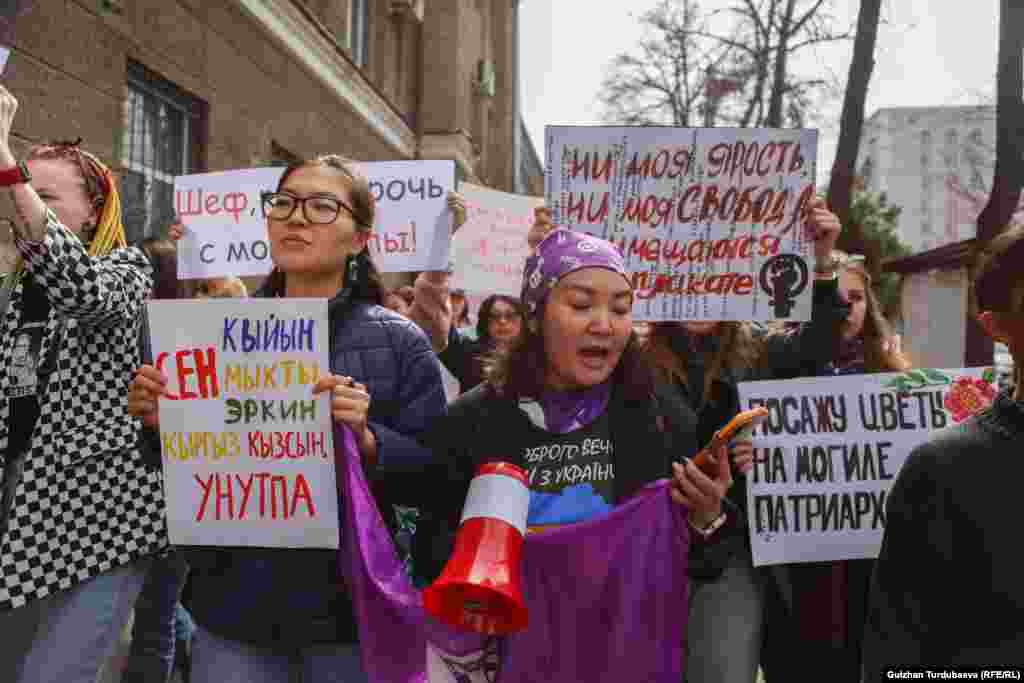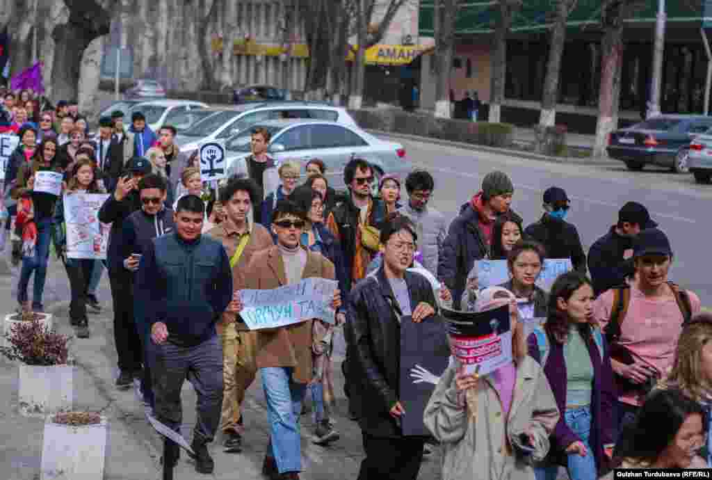 Маршка болжол менен беш жүздөй адам катышты. Жаштар колуна аялдардын эркиндигин, билим алып, өзү каалагандай татыктуу жашоосун, аларды зордук-зомбулуктан коргоону камсыз кылууну талап кылган жазууларды кармап чыгышты.