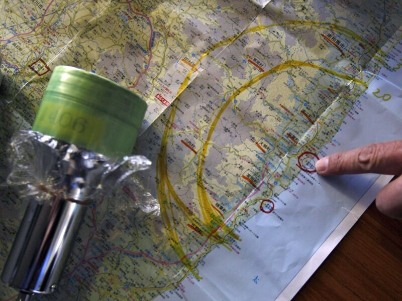 Эвакуациялоо борборунун штаб мүчөлөрү цунамиде жабыркаган АЭС турган жайдын тегерегиндеги аймакты картада белилешүүдө. 4-апрель, 2011