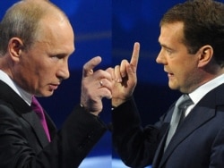 Д. Медведев жана В. Путин "Бирдиктүү Орусия" партиясынын 12-курултайынын соңку күнү. Москва, 25-сентябрь 2011