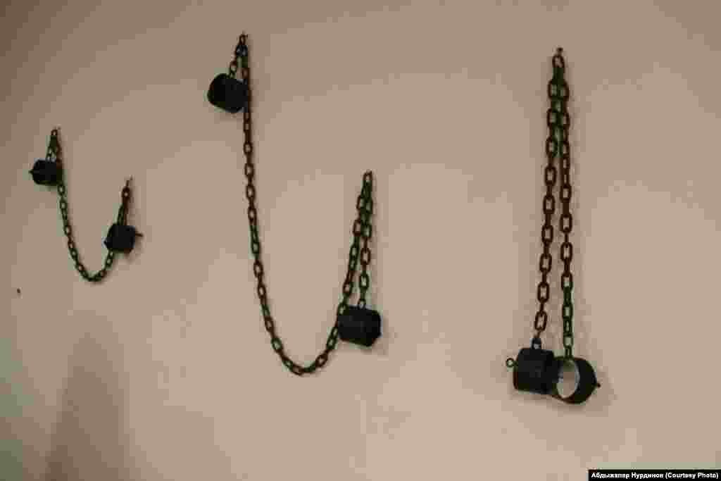 Тюмень шаарындагы №1 СИЗОнун музейинде сакталган абактагылардын буюмдары - чынжырлуу кол кишен.