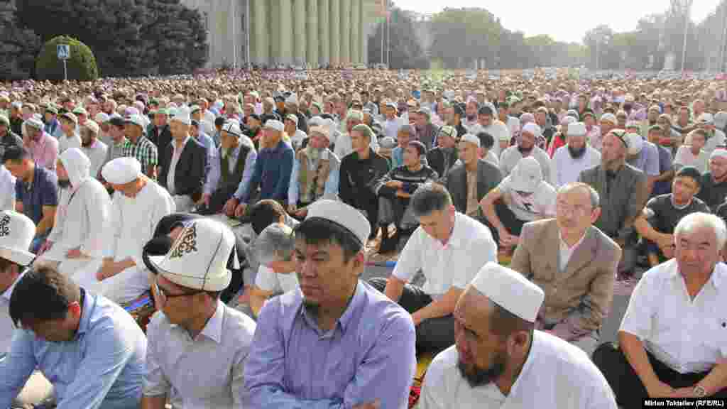 Бишкектеги айт намазы адаттагыдай эле борбордук эски аянтта өтүп, он миңдеген адамдар катышты. (Мирлан Токталиевдин сүрөт баяны)
