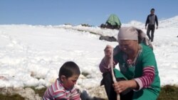 Нарын районундагы Кара-Кужур аймагындагы Тетир-Суу кичи жайлоосунда тизеден кар, ак жайдын күнү болсо да кадимкидей кыш өкүм сүрүп турат. Жергиликтүү малчы Акылбек эки күн жааган кар малчыларды бир топ түйшүккө салып жатканын айтты: