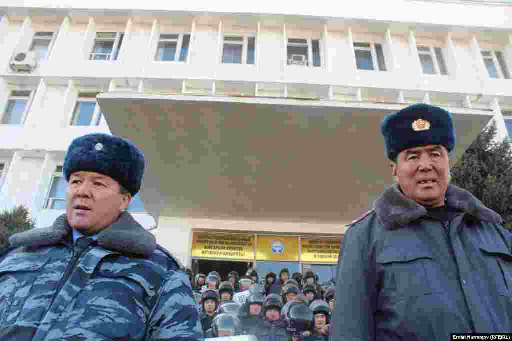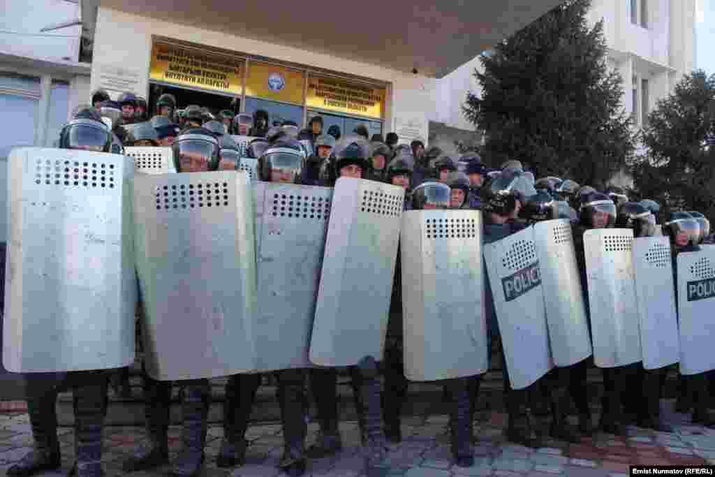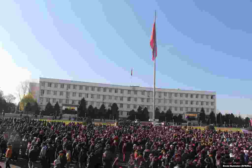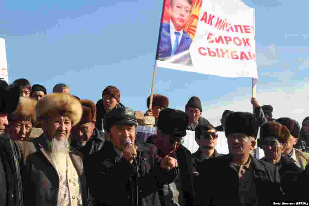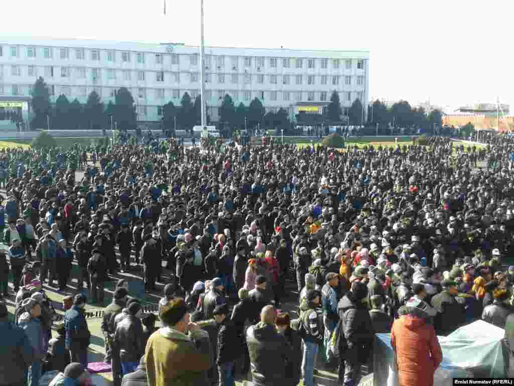 Эки айга камалган депутат Акматбек Келдибековдун тарапкерлери Ош шаарынын борбордук аянтында митинг өткөрүп жатат. Депутатты бошотуу талабы менен чыккандардын арасында атчандар да бар. 2-декабрь, 2013