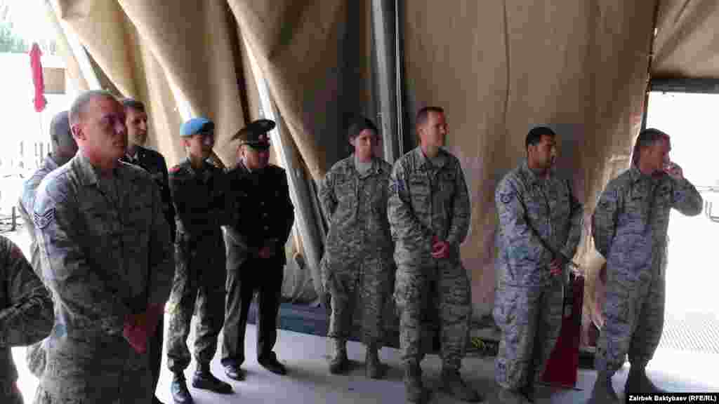 АКШнын Кыргызстандагы элчиси Памела Спратлен, Коргоо министринин биринчи орун басары Замир Суеркулов, Тышкы иштер министринин орун басары Эрнис Оторбаев жана АКШнын Транзиттик борборунун командачысы Жон Миллард.