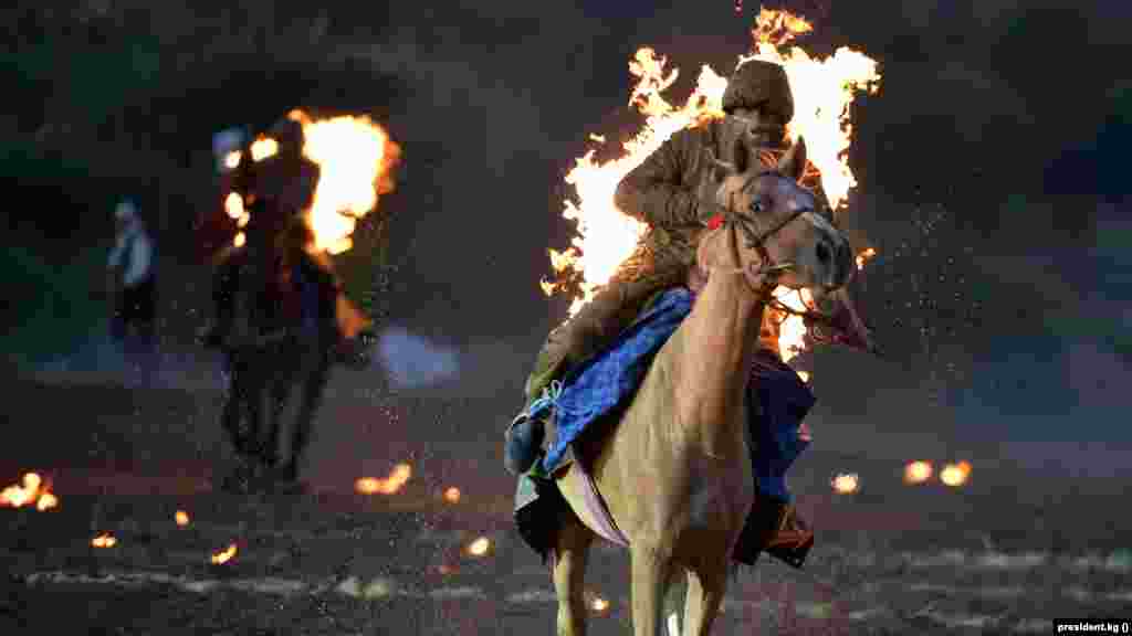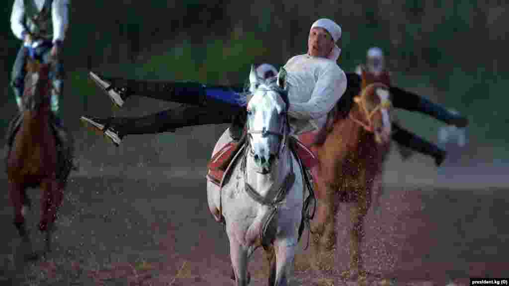 Мамлекет башчыларына ошондой эле салбуурун элементтери камтылган салттуу аңчылык, кыз куумай, андан сырткары каскадёрлордун катышуусундагы оюн-зооктор көрсөтүлдү.