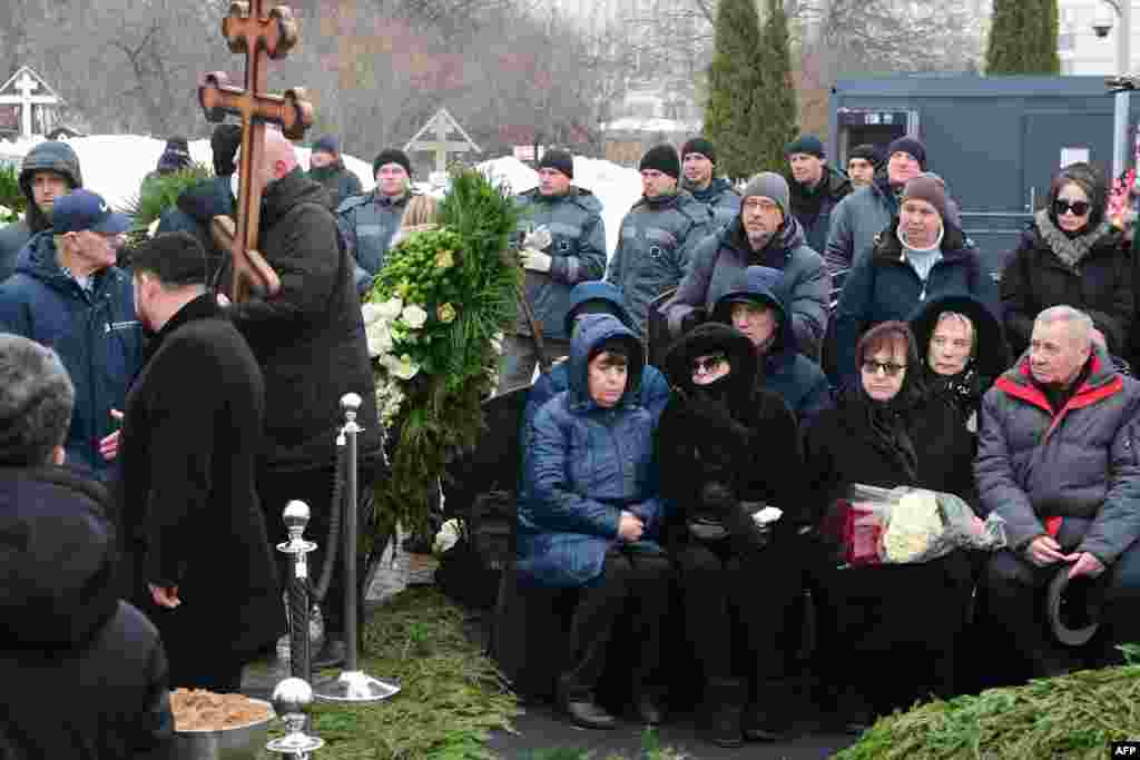 Алексей Навальный менен коштошууга миңдеген адамдар келип, көчөдө жана чиркөөнүн алдында кезекте турушту. Алар "Согушка жол жок", "Путин киши өлтүргүч", "Путинсиз Орусия", "Сен корккон эмессиң, биз да коркпойбуз" деген ураандарды кармап турушту.