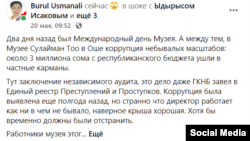 Активист Бурул Усманали "Фейсбуктагы" баракчасына 20-майда маданий жайдагы коррупция тууралуу жазып чыкты. Анда музей текшерилгени жөнүндөгү айрым документтерди дагы тиркеди. Активист буга байланышуу маданий жайдын башчысынын атын атады.