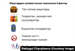 "Студенттер кургак тамакты көп жешет, газдалган суусундуктарды ичишет. Мунун баары тамак сиңирүү органдарынын ишин бузуп жатат. Ашказандын гастрит оорусуна чалдыккандар көбөйдү. Шашып-бушуп тамактанышат, азык жакшы майдаланбаса ашказандын чел кабыгын өйкөп, жара пайда болот. Газдалган суусундуктар болсо ашказандын тамак сиңирүүчү суюктугун бөлүп чыгарууну кечеңдетет. Жакшы чайналбаган тамактын үстүнөн газдалган суусундук ичкенде ашказан кыйналат. Биз окуу жайларга, жатаканаларга барып, студенттерге туура тамактануу жол-жобосун айтып эле жатабыз. Атайын тренингдерди өтөбүз. Бирок күн өткөн сайын ашказаны ооруган улан-кыздар көп кайрылып жатат. Бул тенденция токтобосо, он жылдан кийин жаштардын саламаттыгы таптакыр эле болбой калабы деп чочулайм".
