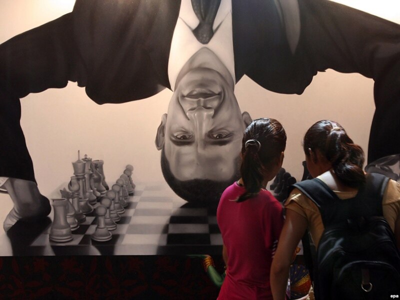 Индус кыздар Жаңы Делидеги "Индиянын көркөм өнөр көргөзмөсүндөгү индиялык Вивак Шарманын АКШ президенти Барак Обамага арналган "Deep" деп аталган көркөм инсталляцияны көрүшүүдө. 21-август 2009