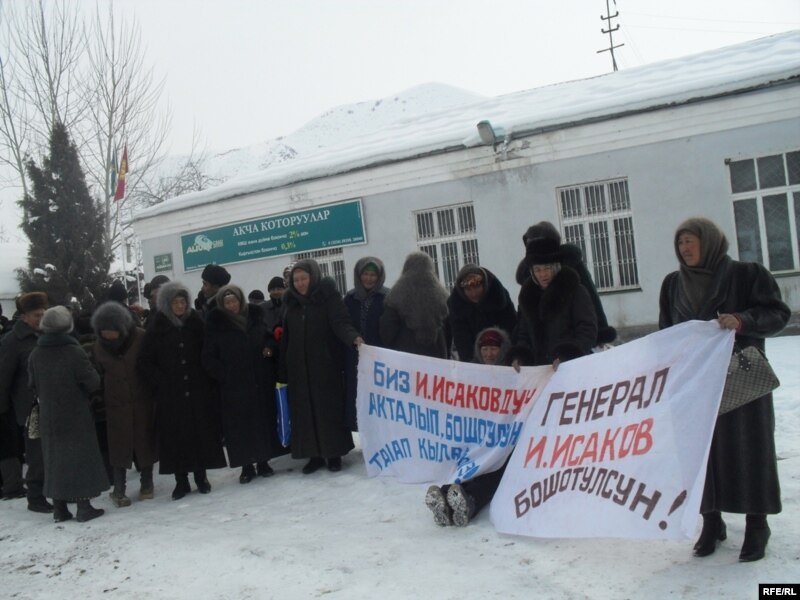 Сегиз жылга кесилген мурдагы коргоо министри Исмаил Исаковдун боштондугун талап кылган жүзгө чукул киши кышкы ызгаарга карабастан Алай райондук акимчилигинин алдында “Генерал Исаков бошотулсун!”, “Биз Исаковдун акталып, бошотулушун талап кылабыз!” деген плакаттарды көтөрүп жети сааттан ашык пикетте турушту.