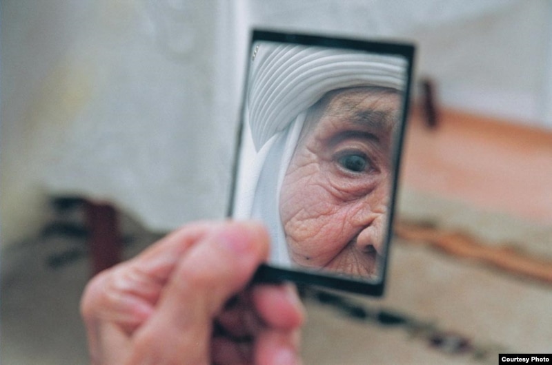 Анда ак элечек кийген улуу актриса бырыш баскан жүзүн күзгүдөн ойлуу карап турат (солдогу сүрөт).