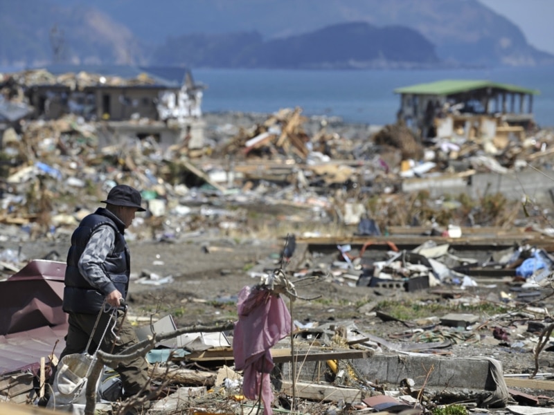 Шоичиро Камайчи 11-марттагы апаатта курман болгон жакындарын эскергени баратат. Ивте перфектурасындагы Оцучи шаары. 12-апрель 2011